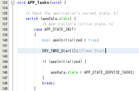 このAPP_Tasks()はmainループで呼ばれる関数で、初期化後にぐるぐる永久に呼ばれる関数です。case APP_STATE_INIT:の部分はメインループの最初の1回だけ実行されますので、ここにタイマーをスタートする関数を書きます。