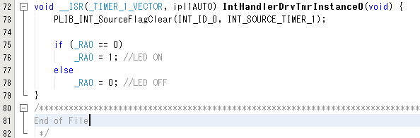 わかりやすく、ポートRA0が0なら1に、そうでなければ0にします。この関数が0.2秒ごとに呼ばれてLEDがON・OFFします。