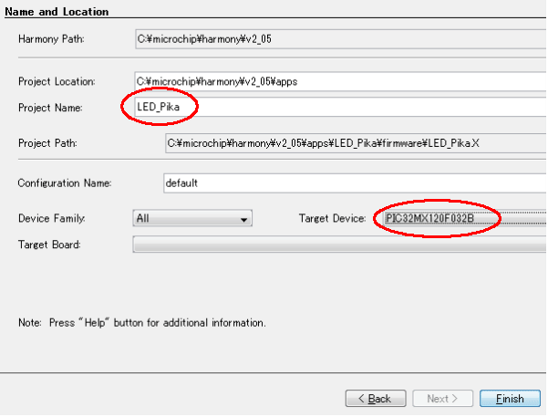• Name and LocationでProject Nameを指定(LED_Pikaにしました)して、Target DeviceにPIC32MX120F032Bを指定してFinish