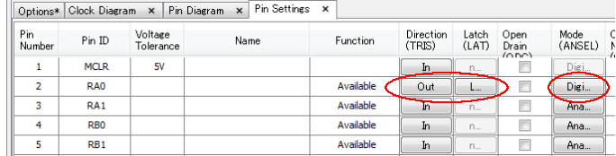 • Pin Settingsタブを選択してRA0ピンのDirectionとModeをクリックして出力ポートに設定します。LEDをピカピカするポートです。