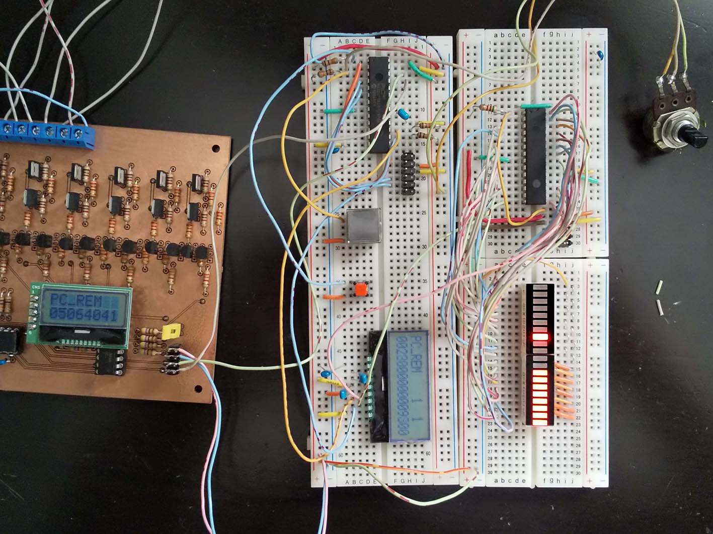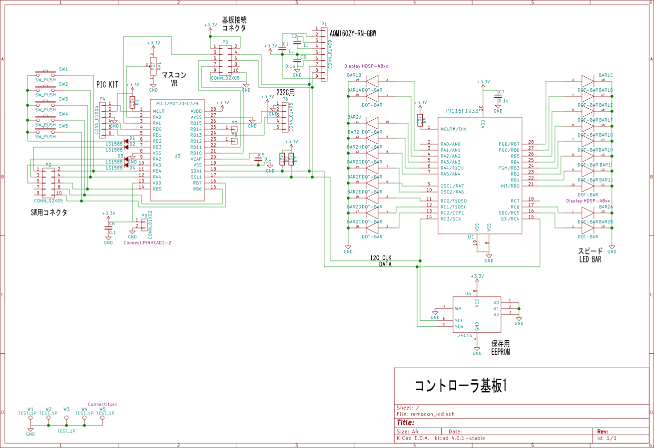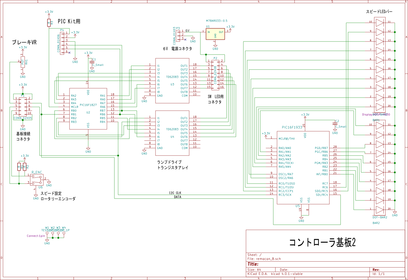 スピードメーターには秋月の赤色バーLEDアレイOSX10201-Rを2個使い、20のLEDバーで速度と実際に駆動しているパワーをLEDの点滅で表示します。LEDバーのコントロールにPIC16F1933を使用して、I2CのSlaveモードでPIC32と通信します。