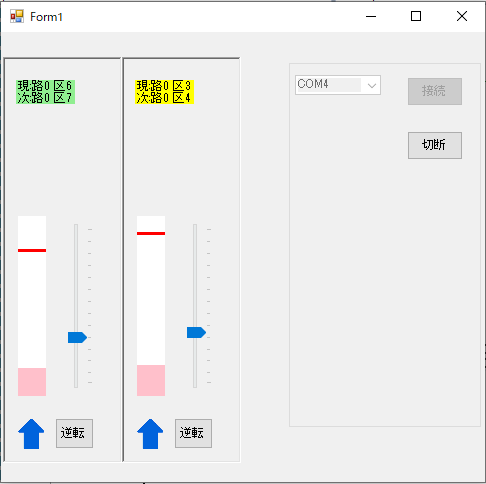 実行して接続するとこうなります。最初の列車の位置は区間1と区間5です。