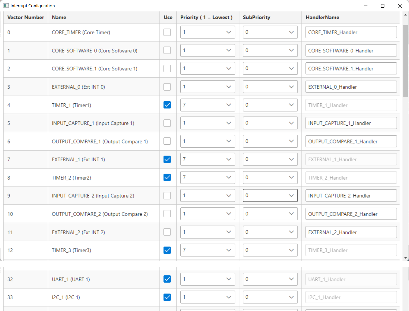 PluginsにあるInterrupt Configrationを選択し、割り込みを設定します。Interruptを使用するところのUseをチェックして、Priorityもセットします。