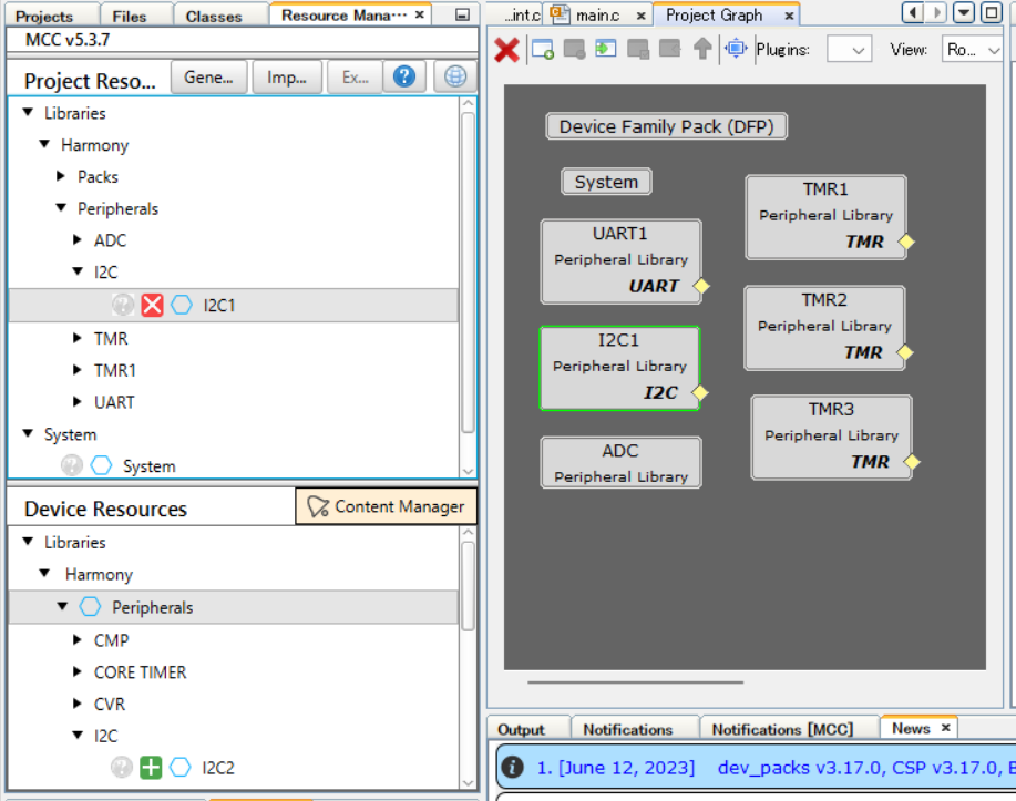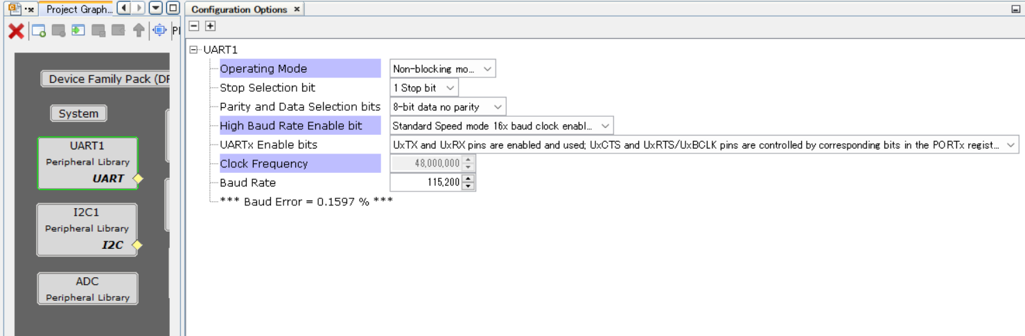 UART1・I2C・ADC・TMR1・TMR2・TMR3を追加します。