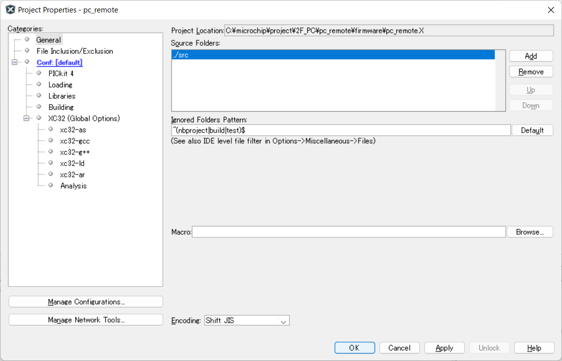 コードを編集する前にProjectsTABでProject名を右クリックしてPropatiesを選択します。Generalをクリックして下のほうのEncodingをShift JISに変更します。