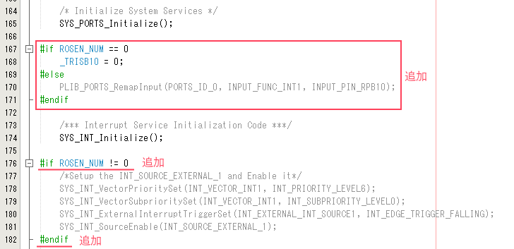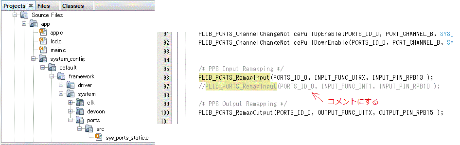 ・MainボードとSubボードのコードをコンパイラ擬似命令で切り替えます。ポートの設定が異なるのでsys_ports_static.cの以下の部分をコメントアウトしておいて、system_init.cで切り替えます。