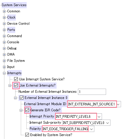 SYS_INT_ExternalInterruptTriggerSet(INT_EXTERNAL_INT_SOURCE1, INT_EDGE_TRIGGER_FALLING);